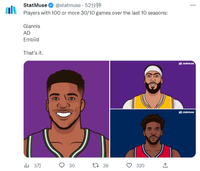 根据美媒《Statmuse》赛后数据统计显示,在过去10个赛季里面,只有字母哥、浓眉、恩比德三人至少在100场比赛中达成30+10。