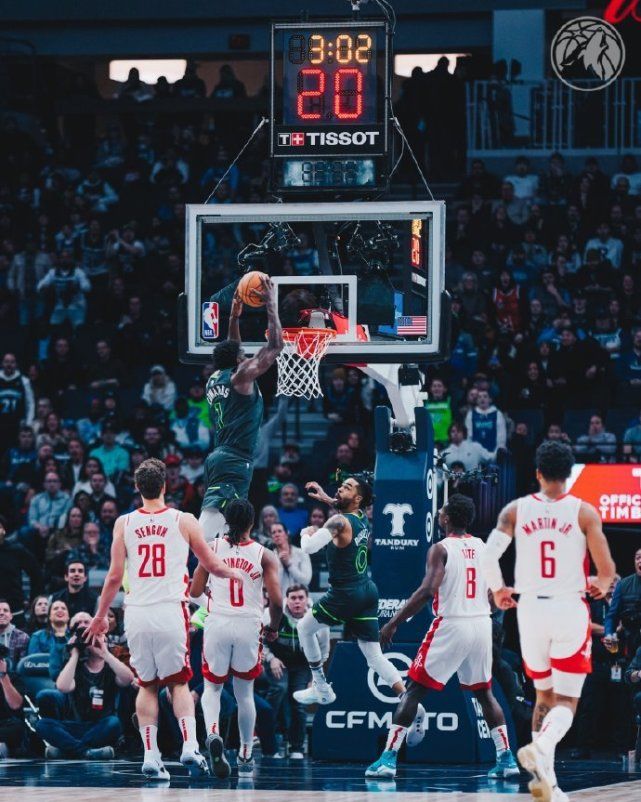 当然,爱德华兹最精彩的还是两度劲爆隔扣火箭新星申京,他在上半场后半段完成一次双手滑翔隔扣申京的好戏。及至第三节比赛,爱德华兹再度单臂滑翔隔扣申京,如此两次隔扣无疑均是十佳球级别的好戏。
