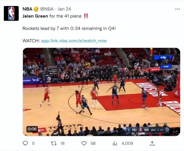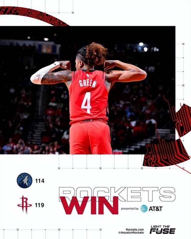 火箭队拿下胜利的第一功臣就是杰伦-格林,这位2021年的榜眼展现了他的大心脏,终场前41.4秒他命中一个将分差拉开到9分的三分球,这个三分球后森林狼就开始犯规战术比赛大局已定。