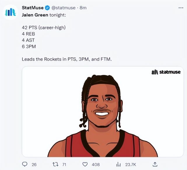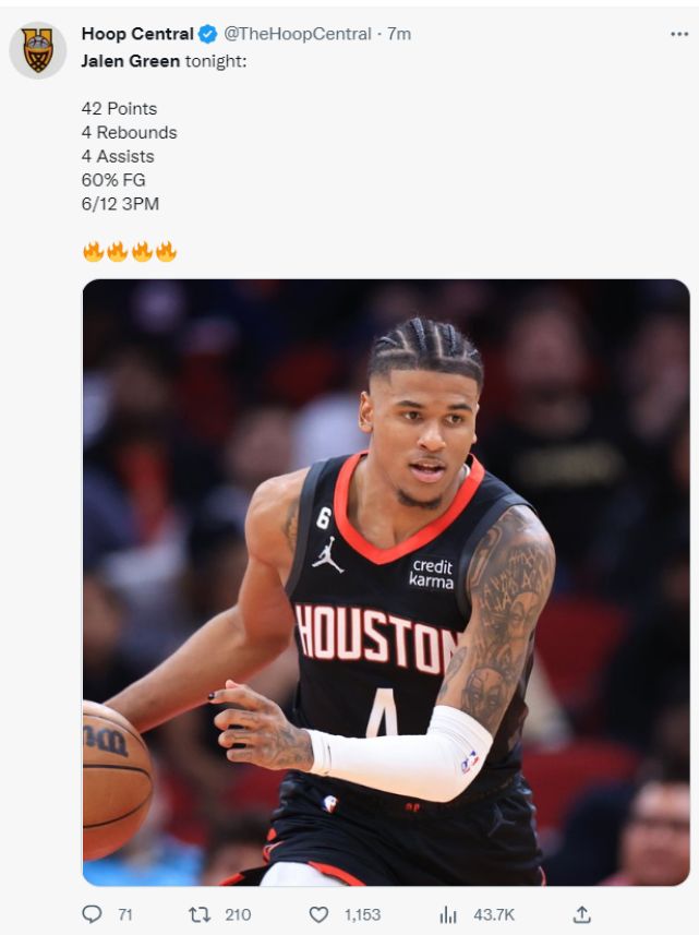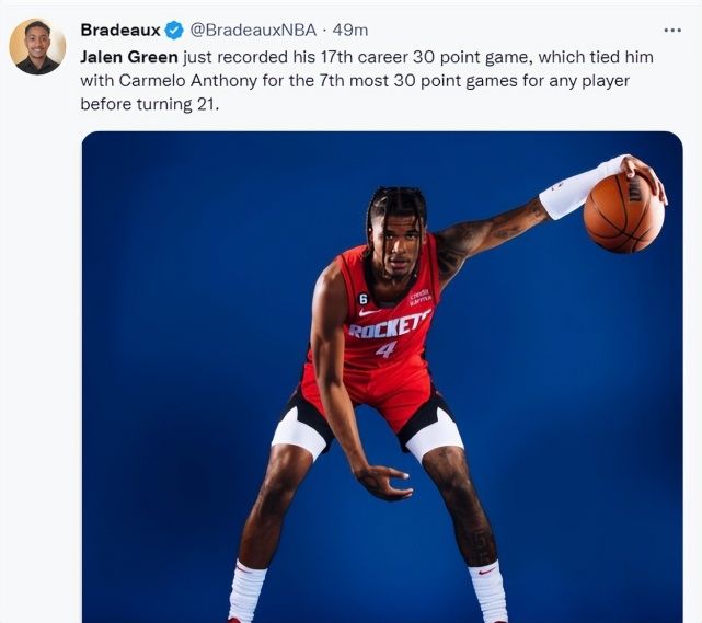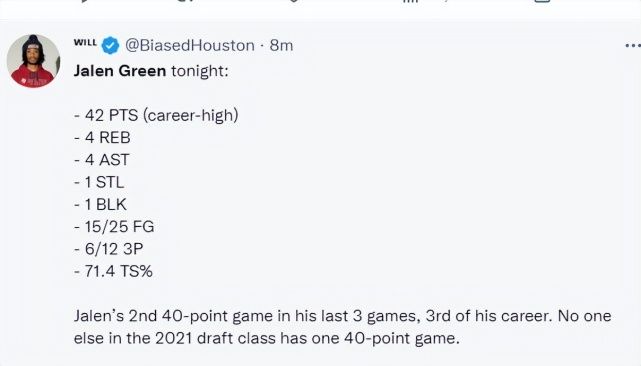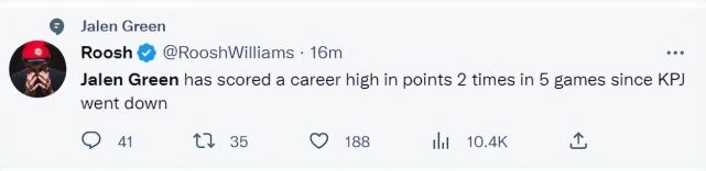 休斯顿记者Roosh写道:自从凯文-波特倒下后,杰伦-格林在五场比赛中两次获得职业生涯最高得分。