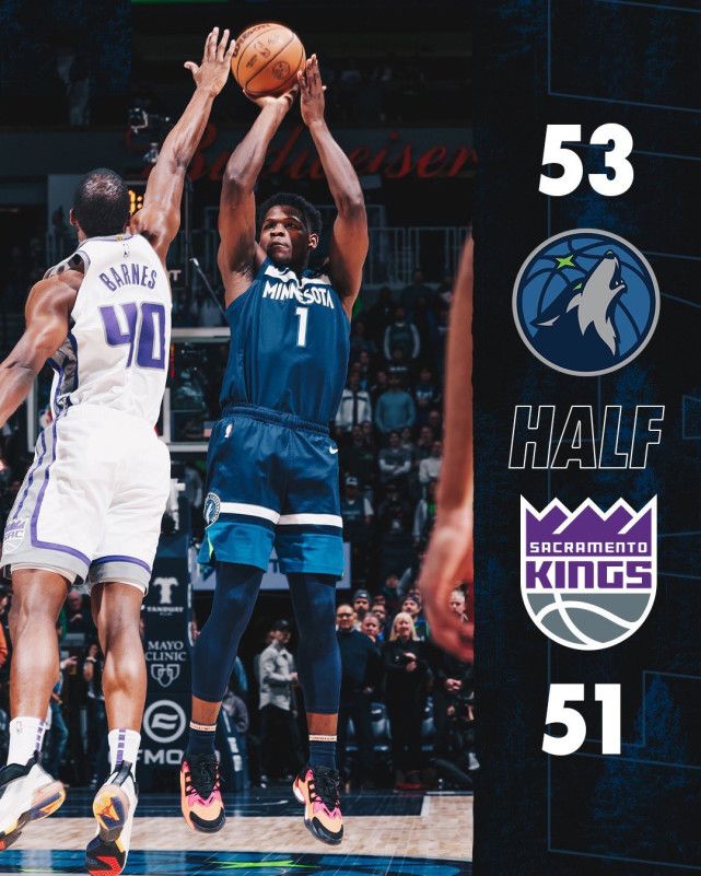 次节上来在戈贝尔与诺威尔的带领下,森林狼不断蚕食分差,小萨、蒙克先后得手回应,在次节还剩7分08秒时,随着诺威尔打成神奇2+1,森林狼将比分追至36平,两队短暂陷入拉锯战,凭借着小萨、默里、福克斯、巴恩斯的表现,国王在节中重新取得领先,节末爱德华兹与里弗斯接连命中三分,半场战罢,森林狼53-51反超领先国王2分。
