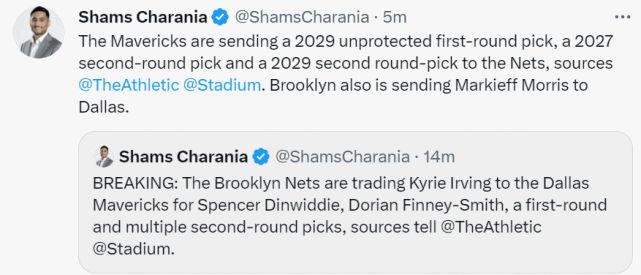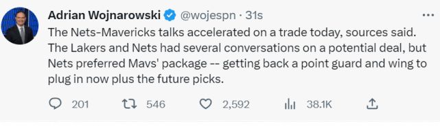 Woj报道称,篮网和独行侠的交易谈判在今日加速,此前,湖人和篮网有过多次谈话,但篮网更喜欢独行侠的报价。通过这份报价,篮网能收回一位控卫,得到一位侧翼,还能获得额外的选秀签。