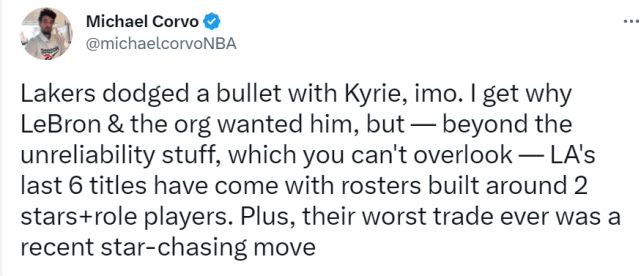 不过,湖人没有换来欧文,未必就是坏事。毕竟,欧文的“黑历史”摆在那里,再加上他常常因伤病缺席。此前就有不少记者劝湖人别追欧文,湖人队记Corvo更是感慨:“湖人躲过了凯里这颗子弹……”