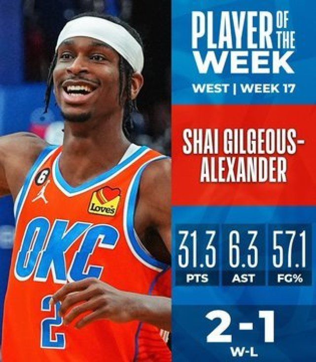 上周,雷霆2胜1负,亚历山大场均31.3分1.7篮板6.3助攻1.3抢断,投篮命中率57.1%。雷霆官方祝贺亚历山大当选周最佳。