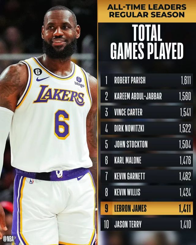 詹姆斯本场迎来第1411场比赛,超越独行侠2011年夺冠的功臣特里1410场,独占历史出场数第9位。詹姆斯距离2003年马刺冠军成员凯文-威利斯1424场仅差13场比赛,湖人本赛季还剩下23场比赛,因为詹姆斯大概率能够本赛季完成超越。