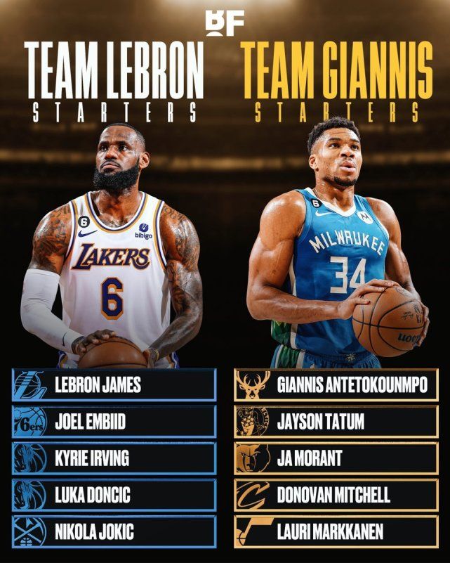 而在选择首发阵容环节,轮到票王詹姆斯先选。詹姆斯第一轮首选恩比德,字母哥选择塔图姆;詹姆斯第二轮选择骑士前队友欧文,字母哥选择莫兰特;詹姆斯第三轮选择东契奇,字母哥选择米切尔;最后一轮,詹姆斯选择约基奇,把马尔卡宁留给字母哥。有趣的是詹姆斯还没有选,约基奇自己就走下台,揉着老詹的肩膀,两人开心大笑。
