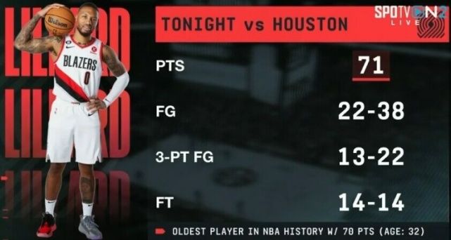 北京时间2月27日,开拓者主场131比114击败火箭,利拉德在这一战大爆发,38投22中,三分球22投13中,罚球14中14,得到71分6篮板6助攻。这一战利拉德创造了多项纪录。
