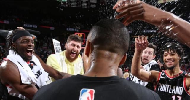 表现疯狂的利拉德在社交媒体引发热议,詹姆斯发布了一张手表的表情图,相当于向利拉德致敬。赛后,队友们纷纷往利拉德头上浇水庆祝,让他享受NBA传统的庆祝礼