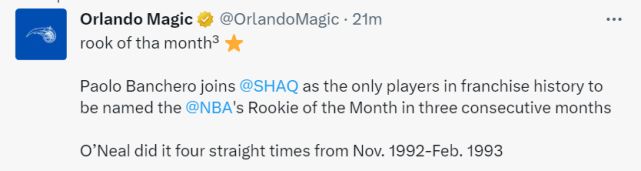 2月的东部月最佳新秀,属于魔术的状元班凯罗,他连续三个月获得这一奖项。2月的比赛中,班凯罗场均贡献16.6分7.5篮板3.3助攻。魔术官方晒图祝贺班凯罗再次当选。