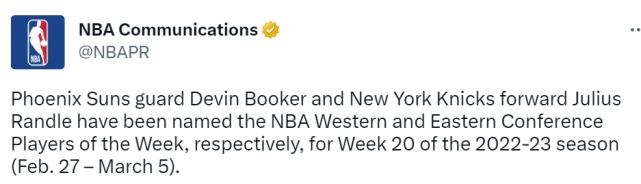 北京时间3月7日,NBA官方宣布了第20周的周最佳球员。尼克斯的兰德尔当选东部周最佳球员,这是兰德尔本赛季首次当选周最佳,也是生涯第2次获此殊荣。太阳的布克当选西部周最佳球员,这也是布克本赛季首次当选周最佳,生涯第7次获得这一奖项。浓眉、字母哥、哈登等球星获得提名。