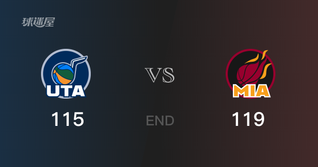 全场比赛,热火球员巴特勒砍下24分;爵士球员马尔卡宁砍下38分。全场结束,热火以119-115击败爵士。