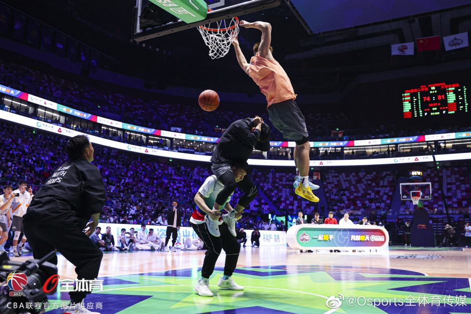 第二扣杨浩找到两人帮忙,两人叠罗汉,徐杰持球在上,杨浩飞跃两人完成背扣,直接点燃现场,毫无悬念拿下50分。
