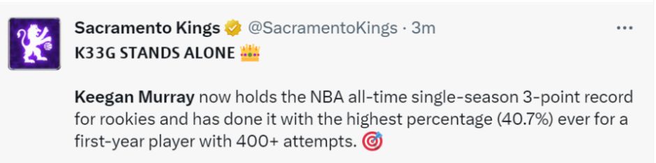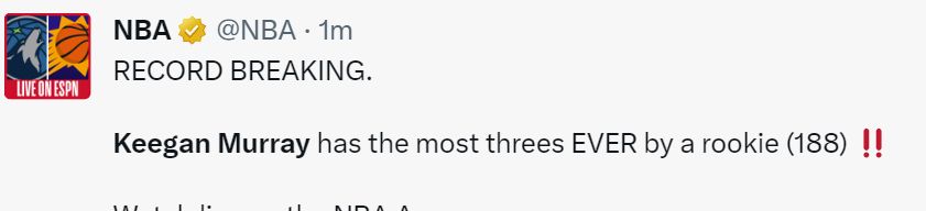 本场比赛前,默里已经投中185个三分球。他在比赛中连续超过利拉德和米切尔,成为新的纪录保持者。作为一位身高2米03的前锋,默里本赛季场均11.9分,三分命中率高达40.7%。他在爱荷华大学打了两个赛季,第一季主要是打替补,场均7.2分5.1篮板,三分命中率29.6%,而第二季成为主力后迎来大爆发,场均23.5分8.7篮板,三分命中率也达到39.8%,进步相当明显。