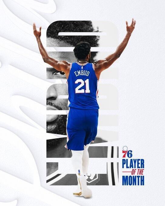 恩比德是2019-20赛季以来第一位单赛季三次当选月最佳的球员,也是76人队史上第一位做到这一点的球员。他在3-4月总共得到599分,领跑全联盟,本赛季常规赛,恩比德场均33.1分10.2篮板4.2助攻,帮助76人获得54胜28负的战绩。