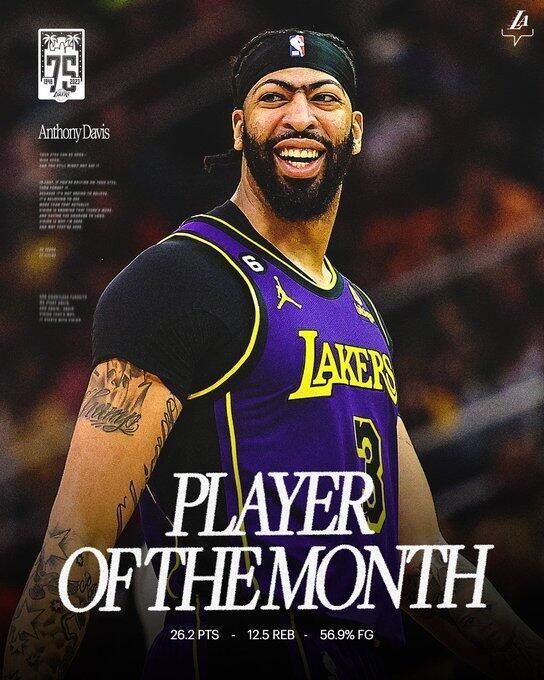 这是浓眉湖人生涯的首次月最佳。本赛季常规赛,浓眉场均25.9分12.5篮板2.6助攻2.0盖帽,帮助湖人获得43胜39负的战绩。他也成为奥尼尔之后第一位单赛季场均至少25分12篮板2盖帽的湖人球员。