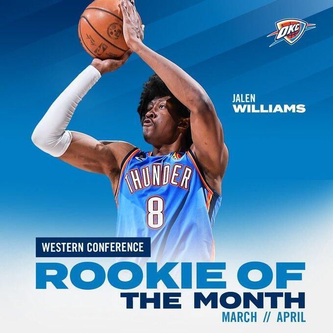 3-4月份,杰伦-威廉姆斯场均得到18.7分5.5篮板4.3助攻,当选西部月最佳新秀。威廉姆斯本赛季第二次当选月最佳新秀,成为雷霆队史第三位多次当选的新秀。