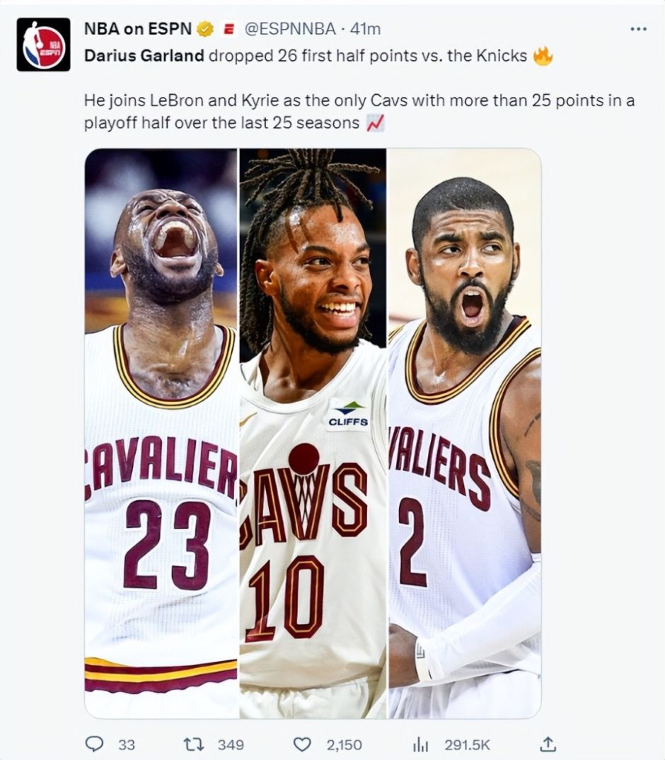 根据NBA官方统计,加兰半场对阵尼克斯拿26分,是过去25个赛季詹姆斯、欧文后第一位季后赛半场25分的球员。