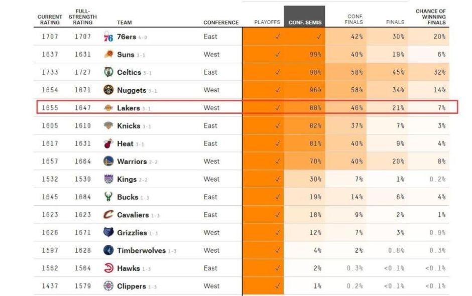 湖人如今3比1领先灰熊,历史上湖人在7战4胜的系列赛中,取得3-1领先时,系列赛战绩为38胜1负。湖人现在晋级的概率非常高了。美媒更新了晋级概率榜,湖人晋级下一轮的概率已经来到了88%。