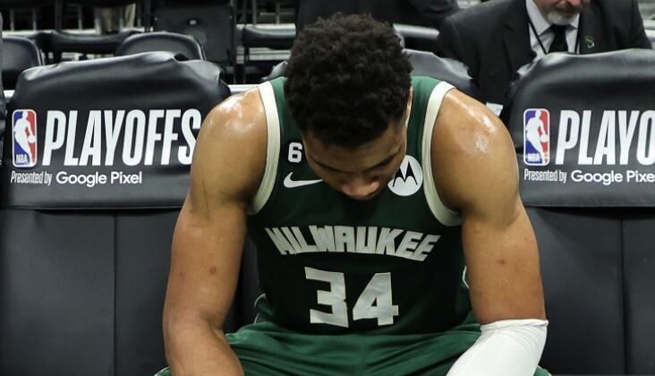 输球之后,字母哥一脸沮丧,他坐在板凳席上低着头。这是字母哥失望的夜晚,他23罚10中太惨淡,如果他多罚进一两个球,也许雄鹿就赢球了。字母哥也失去了一个冲击冠军的机会。