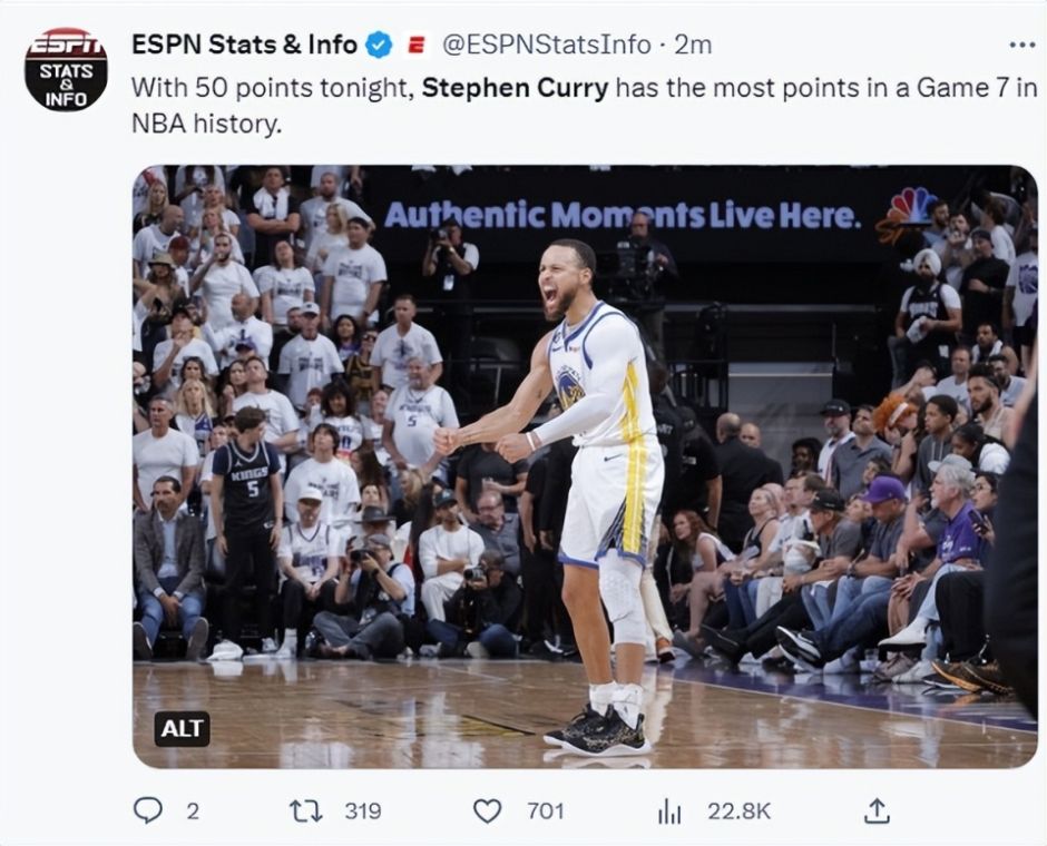库里抢七大战50分是NBA历史最高,50分也是库里季后赛生涯新高。