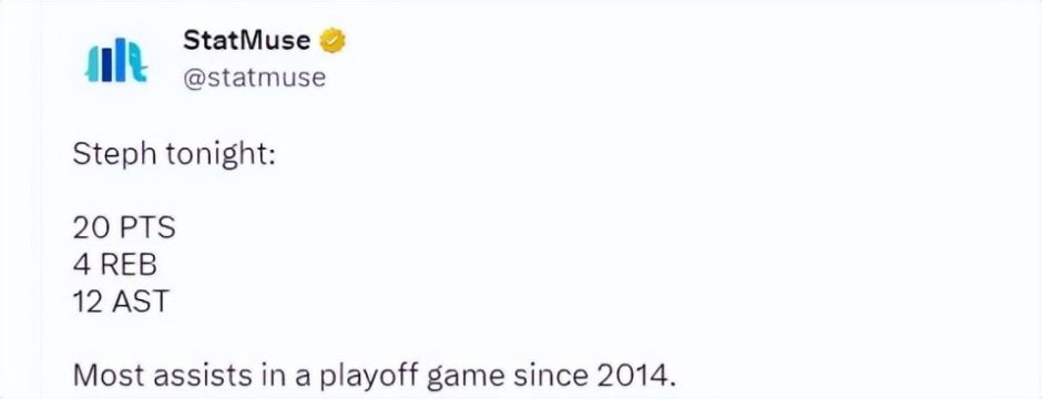 这场比赛,勇士三巨头展现了为什么他们能打造王朝,他们都发挥了自己的能量。汤神三分神准,库里展现了库有引力,正是他上半场不断为队友创造进攻机会,为勇士打通任督二脉,找到了进攻模式。这是库里生涯第三次在季后赛单场至少送出12次助攻,上一次还是在2014年4月25日勇士对阵快船首轮第三战。