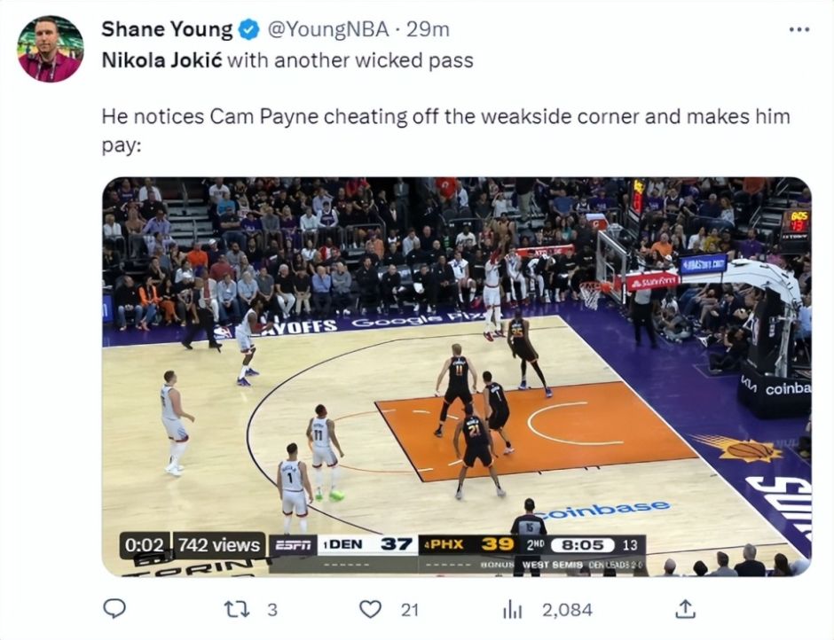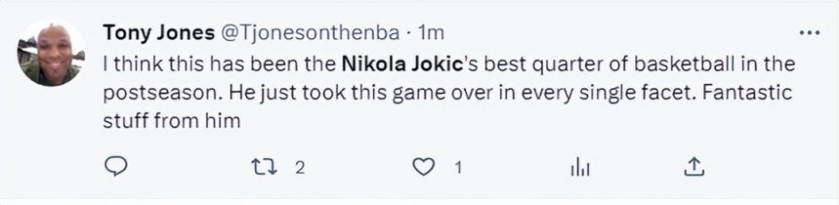 爵士记者托尼-琼斯写道:我认为这是尼古拉·约基奇季后赛中表现最好的一个季度。他接管比赛的任何一个方面。