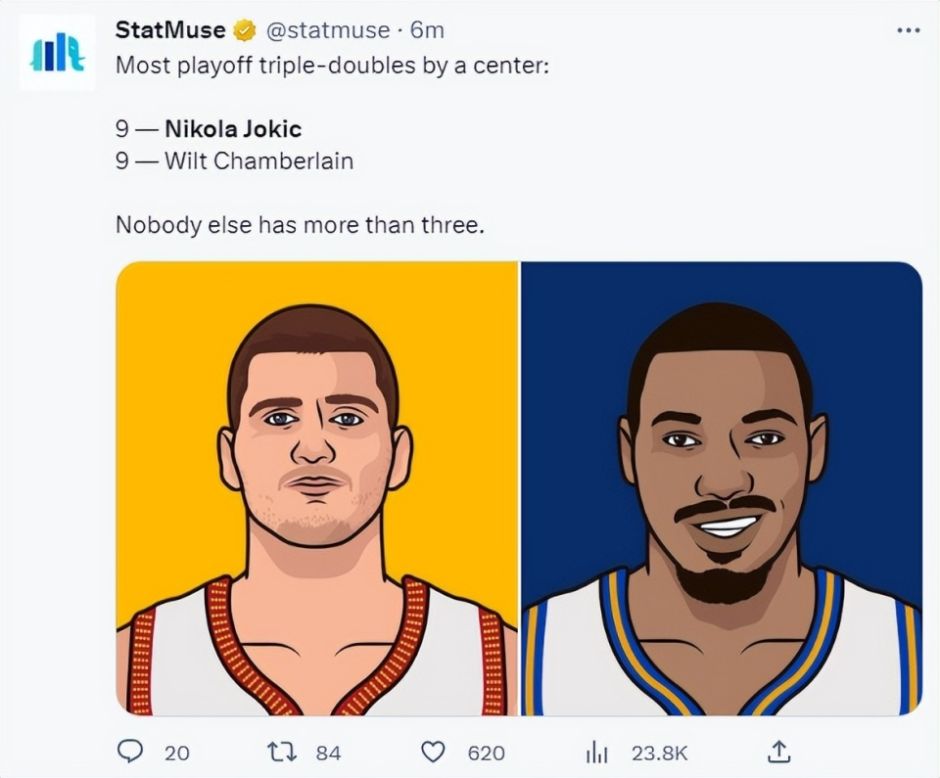 约基奇此役又创造多项纪录:1.本赛季的季后赛第三次三双,生涯第九次;