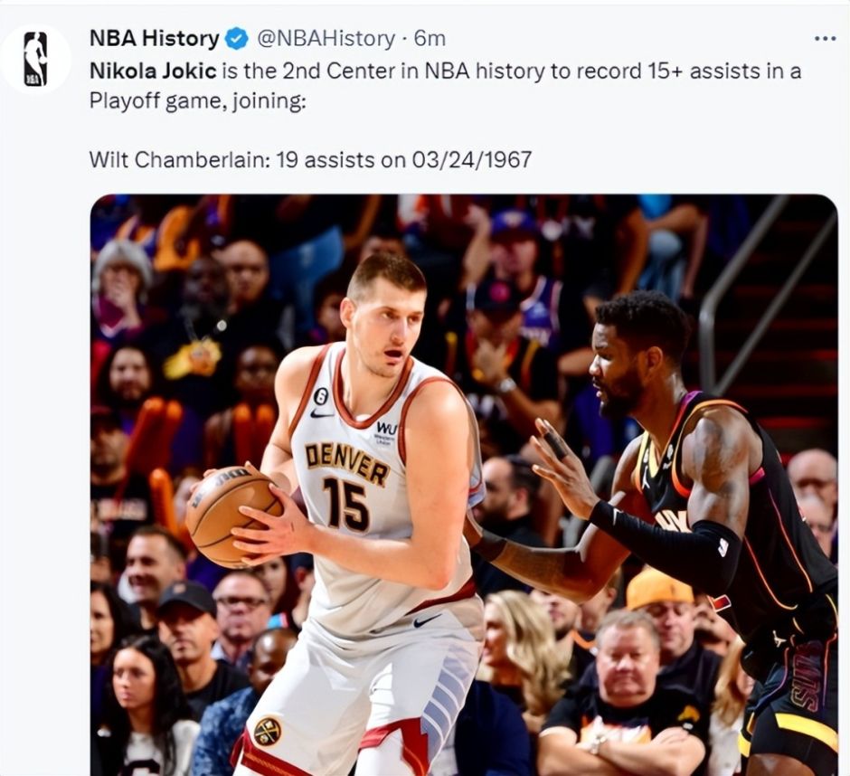 4.约基奇是历史第二个在季后赛超过15+助攻的中锋,张伯伦1967年3月24日曾19次助攻。
