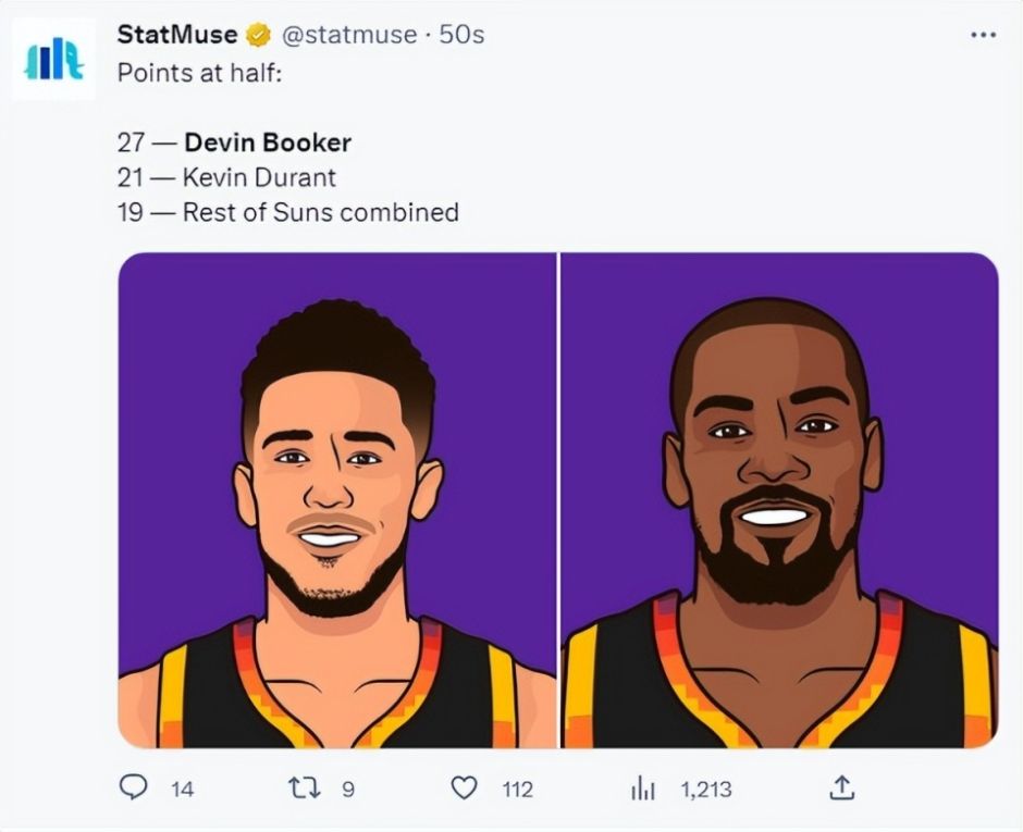 上半场布克15中12,三分5中3,拿下27分4篮板3助攻3抢断;杜兰特16中5,罚球12中11,拿下21分6篮板5助攻1盖帽,这两人数据都很炸裂。