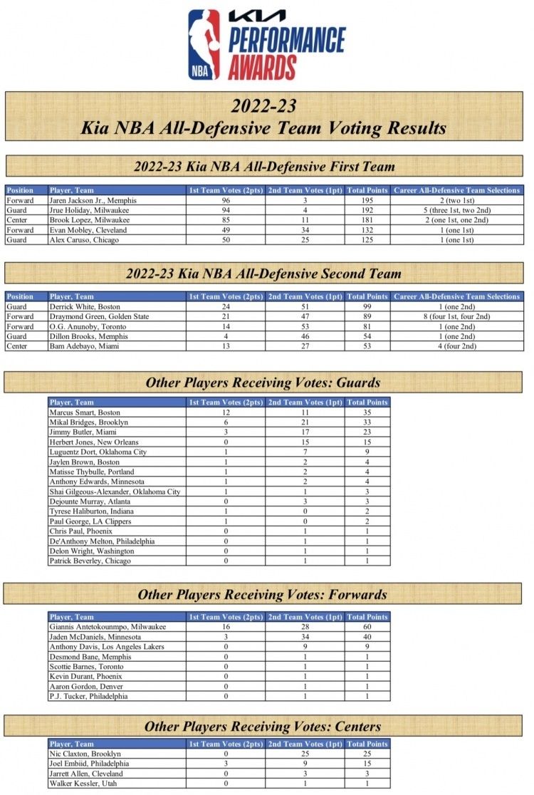 入选一阵的五位中,霍乐迪是入选最佳防守阵容次数最多的球员,生涯至今5次入选最佳防守阵容,其中3次是一阵。大洛和小贾伦-杰克逊都是两次入选最佳防守阵容,莫布里和卡鲁索都是首次入选。得票方面,今年的最佳防守球员小贾伦-杰克逊得到96张第一选票,总分195分。霍乐迪得到94张第一选票,总分192分。大洛181分,莫布里132分,卡鲁索125分。