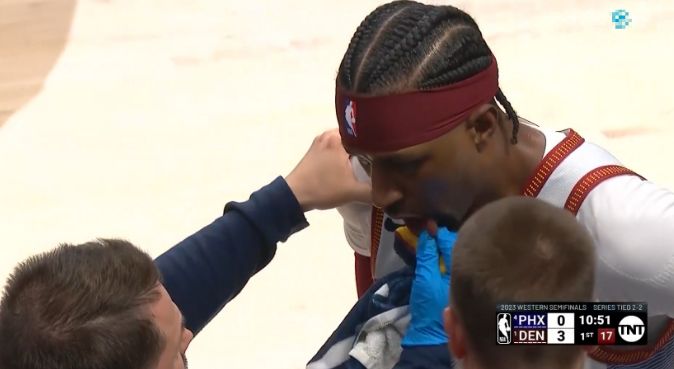 首节开局波普被布克肘击嘴巴被打出血,裁判叫医疗暂停进行治疗。