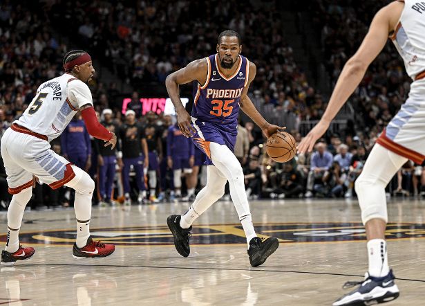 易边再战,蒙蒂用沙梅特顶替奥科吉首发,约基奇与穆雷携手打出7-0攻势扩大10分领先,穆雷与布克一度发生摩擦,杜兰特上篮与滑翔暴扣连追4分。约基奇连得4分打停太阳,太阳继续打铁,约基奇与小波特各中一记三分,掘金下半场已经打出17-4攻势扩大16分领先。艾顿内线勾手命中,掘金连续罚中4球,杜兰特被吹罚第4次犯规被换下场,艾顿抛射命中。布克三不沾与艾顿补扣不中,约基奇内线连得4分扩大77-57领先20分优势,奥科吉两罚一中与布朗两罚全中。罗斯三分追分,掘金继续压制维持20分优势,罗斯再中一记三分,掘金一波6-2攻势扩大21分优势。布朗与约基奇接连去偷听太阳战术,杜兰特怒推布朗与约基奇,杜兰特与布朗各被吹罚一T,布克三分命中,约基奇回敬2分,杜兰特0.4秒大号两分命中,掘金单节39-25净胜14分,三节结束掘金91-74领先太阳。前三节杜兰特20+8+4与布克22+6+4、艾顿10+9,约基奇27+10+9,小波特19+8与布朗15分。