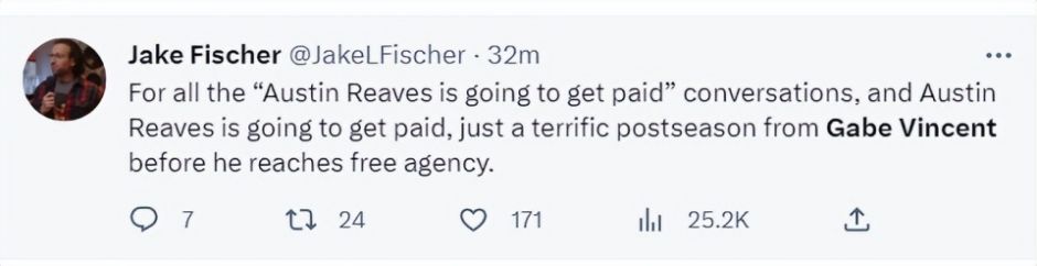 BR记者杰克-费舍尔写道:人们都在说奥斯汀-里夫斯会在今夏获得一份大合同,那么文森特也应该获得一份大合同,他在自由身来临前打出了完美的季后赛表现。