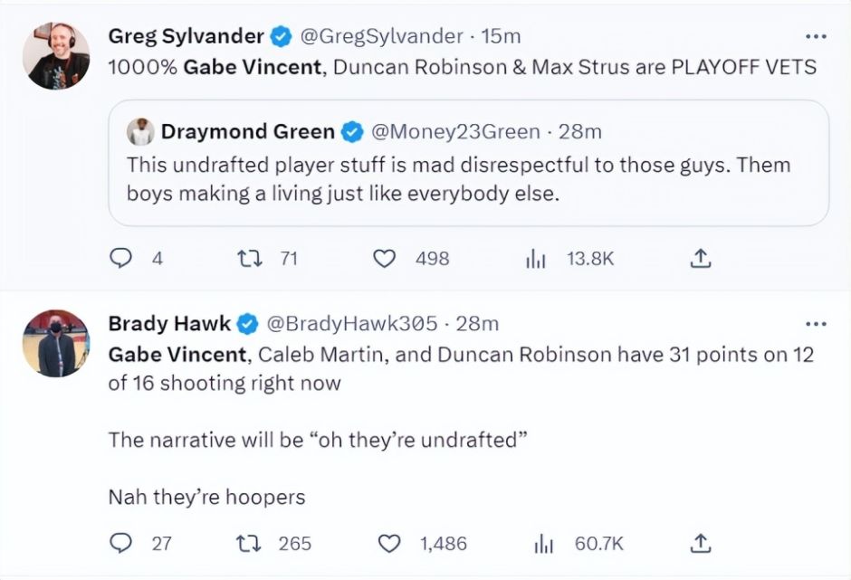 热火多位记者都在点赞这些落选秀们,文森特、马丁、邓罗合计16中12拿下31分,你们需要对这些落选秀有最大的尊重,他们都是季后赛老兵。