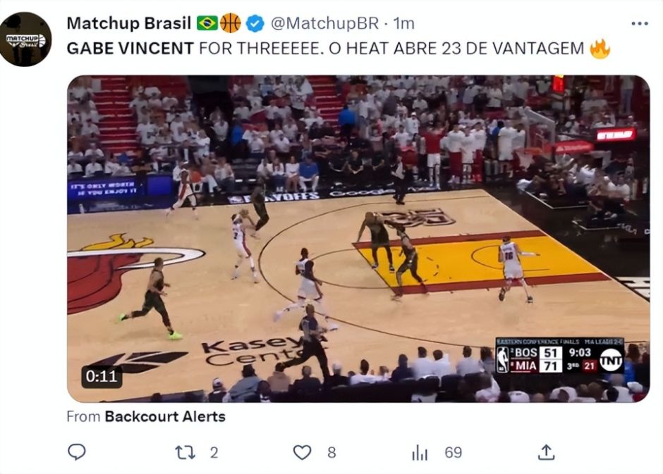 文森特的表演还在延续,第三节开场斯玛特2+1后他立马突破回应,转换的三分再中帮助热火拉开到23分打停绿凯。