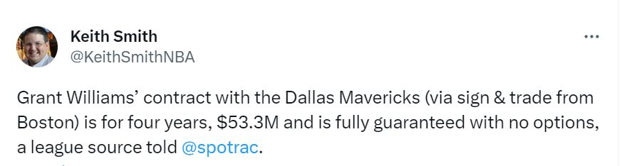 据名记Keith Smith报道,消息人士透露,格威的具体合同为4年5330万,全额保障,没有任何选项。2022-23赛季,格威为绿军出战79场,场均8.1分4.6篮板1.7助攻。