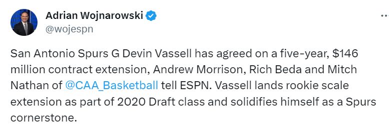 北京时间10月3日,据ESPN名记Woj报道,经纪人透露,马刺队后卫德文-瓦塞尔已经同意与球队达成一份为期 5 年价值 1.46 亿美元的提前续约合同。