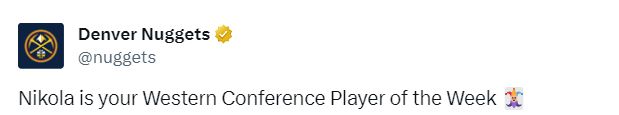 上周,掘金获得3胜0负的战绩,约基奇场均26.3分13篮板7.7助攻,投篮命中率61.5%,三分命中率45.5%,罚球命中率76.9%。掘金官方晒图祝贺约基奇获奖。