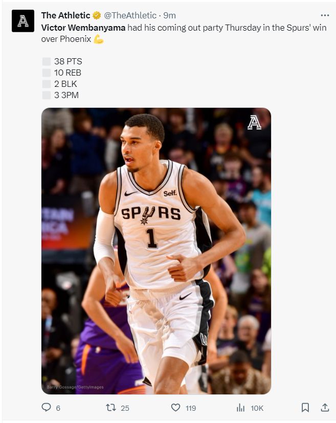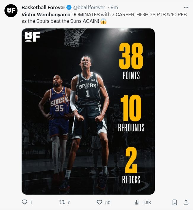 北京时间11月3日,马刺客场132-121拒绝太阳逆转,本赛季马刺已经双杀太阳。这场比赛马刺一度领先太阳27分之多,末节布克带队将比分扳平,可状元郎文班亚马157秒里连拿10分击溃太阳,他完成了盖世一夜。