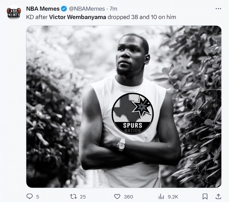 美媒NBA Meme调侃杜兰特:KD的下一站应该是圣安东尼奥马刺队。