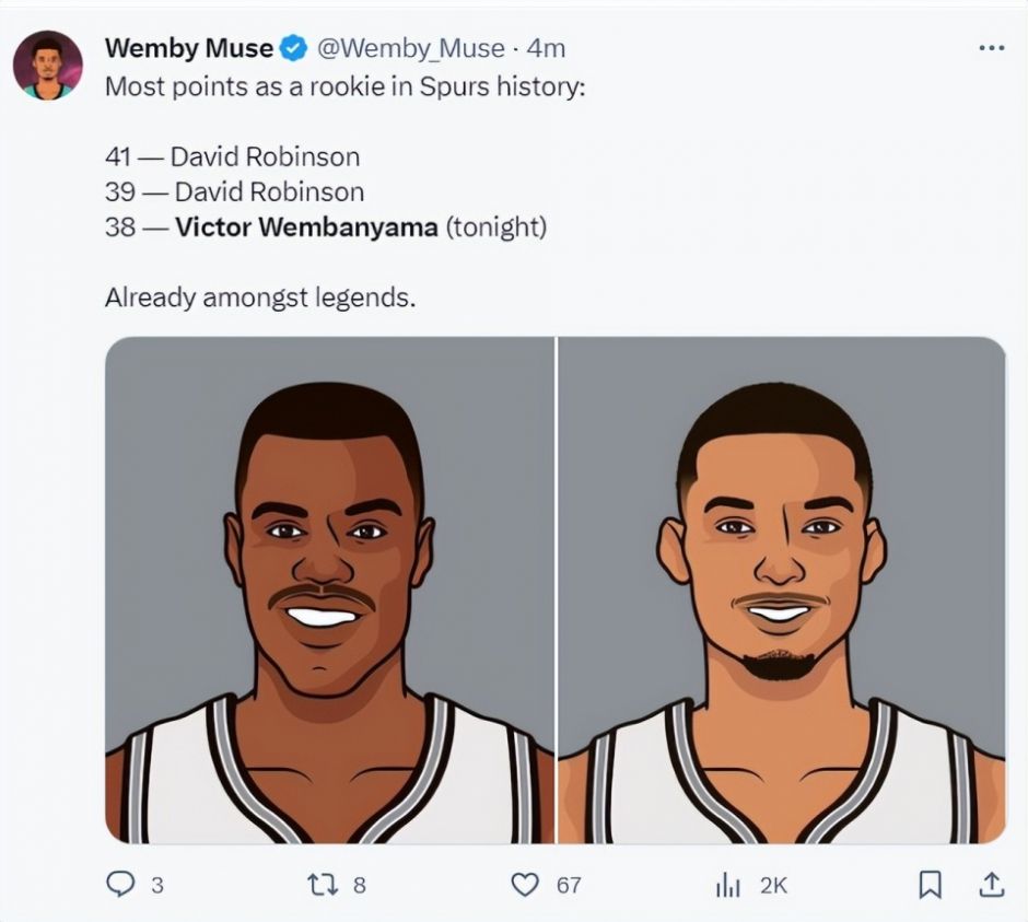 2.文班亚马是马刺队史新秀得分第三高的球员,前两次都是大卫-罗宾逊;