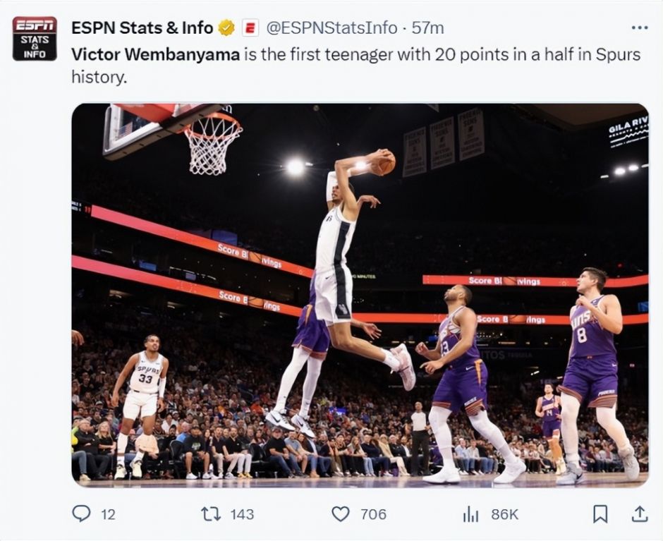 1.文班亚马是马刺队史第一位半场拿下20+的球员;
