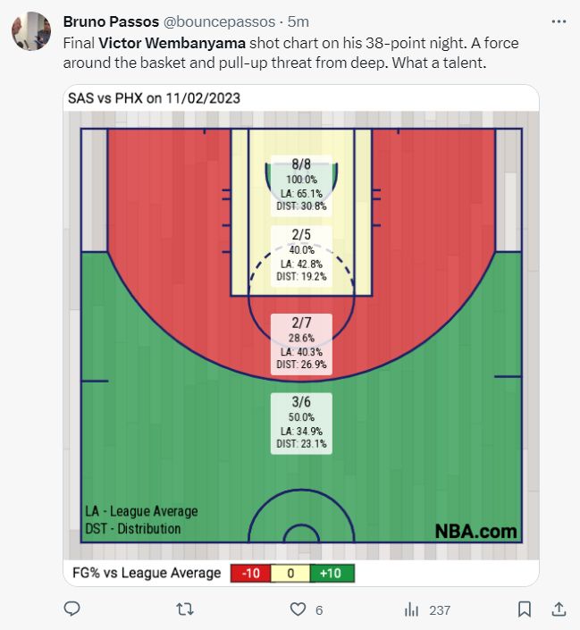 马刺记者晒出文班亚马这一场比赛的投篮热区,他在篮下8中8,命中率100%,都说文班亚马身材太瘦不会直接适应NBA对抗,可结果却并不是这样,他很适应。