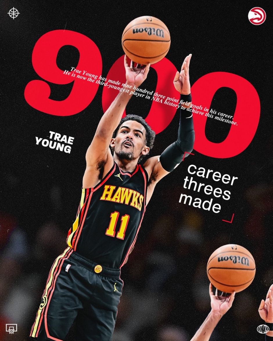 其四,特雷-杨还达成历史第3年轻命中900记三分里程碑纪录。
