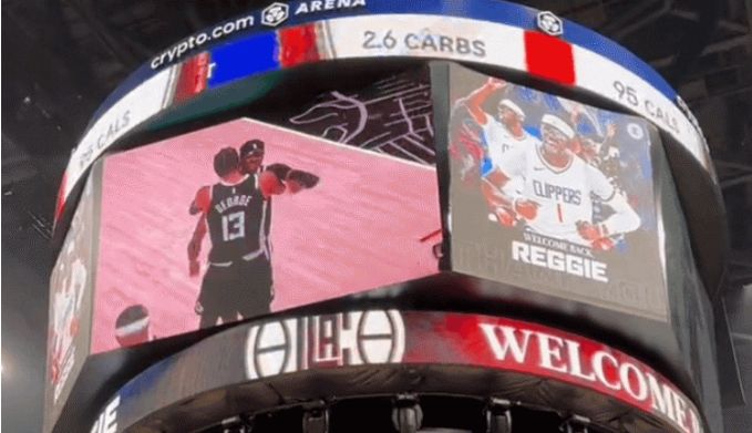 快船主场播放集锦致敬雷吉,现场球迷高喊“雷吉”,雷吉曾效力快船3个半赛季。