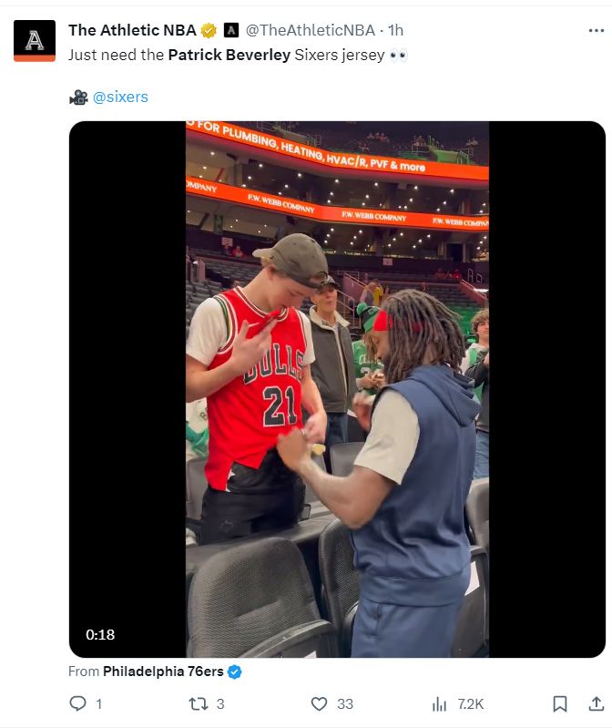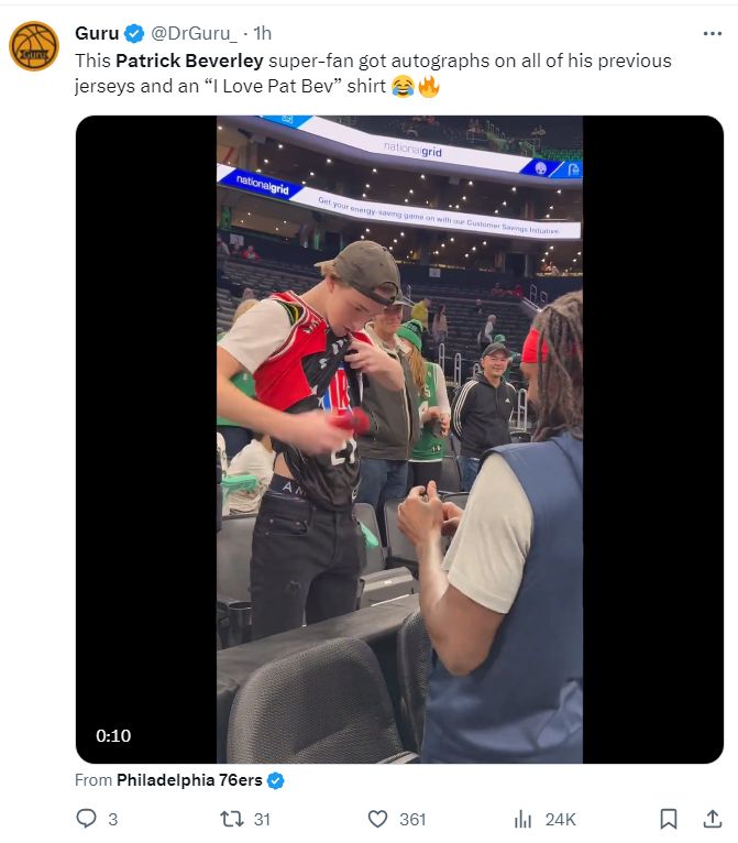 多家媒体都晒出了客场一位小球迷与贝弗利的互动,这位小球迷穿着贝弗利所有的球衣:公牛、森林狼、湖人、快船、费城、火箭,贝弗利还一一为这个小球迷签名。