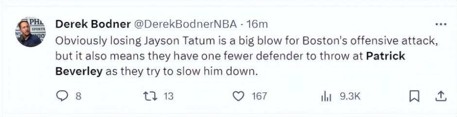 绿凯记者写道:显然绿凯失去塔图姆对进攻是一个很大的打击,这也意味着他们在防守贝弗利时少一个防守者。