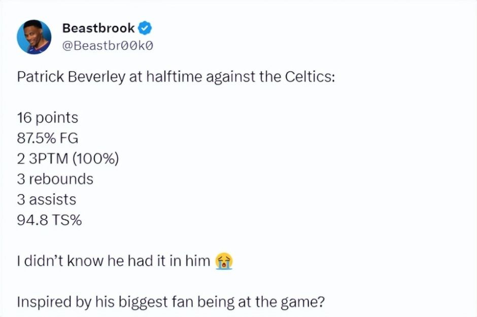 美媒晒出贝弗利半场的数据8中7,三分2中2拿下16分3篮板3助攻,命中率87.5%,真实命中率94.8%。很难相信不是球迷给贝弗利的力量。