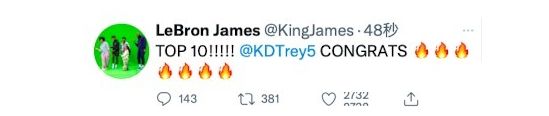 杜兰特在次节比赛再得10分,尤其是他一度连续冲击掘金防线得分,上半场出战16分钟,已经15中8合计得到22分,让他生涯总分超越摩西-马龙,升至历史第10位迎来里程碑。詹姆斯通过社媒祝贺杜兰特:“历史前十!!!!!杜兰特恭喜。”詹姆斯与杜兰特是现役仅有的两位,总得分跻身历史前十的球员,而詹姆斯高居历史第一。