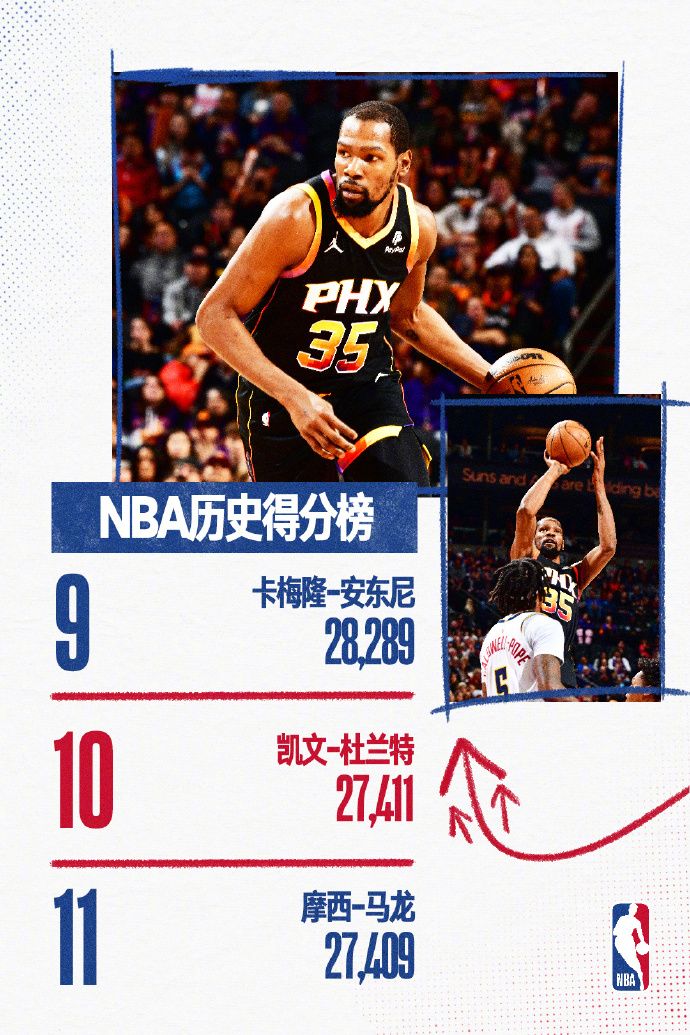 其一,杜兰特生涯总得分超越摩西-马龙,升至历史第10位,前一位是安东尼,而现役仅次于詹姆斯。